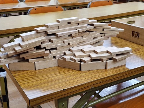 かまぼこの板のような形の積み木で作られています。