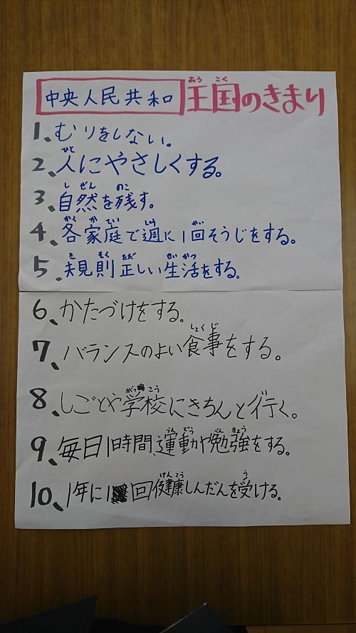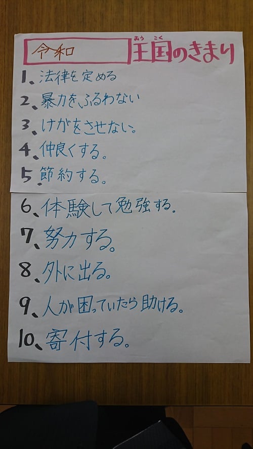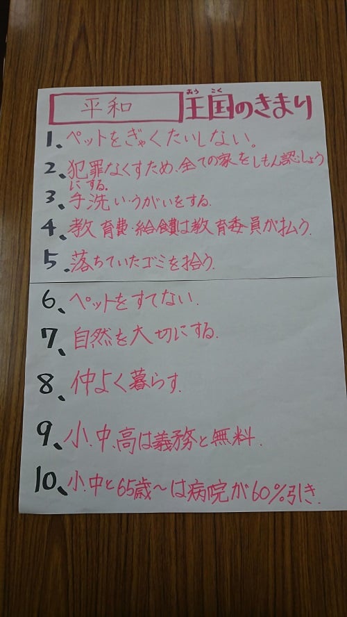 話し合いをして最終的に10個の決まりを決めて発表してもらいました。