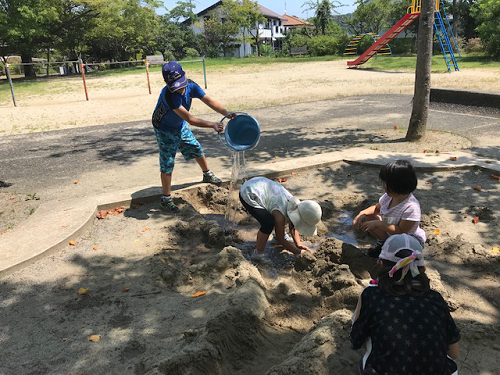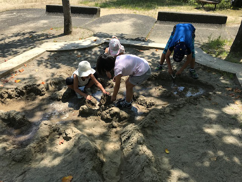 元気な4人は、公園に着くなり砂場でどろんこ遊びです。